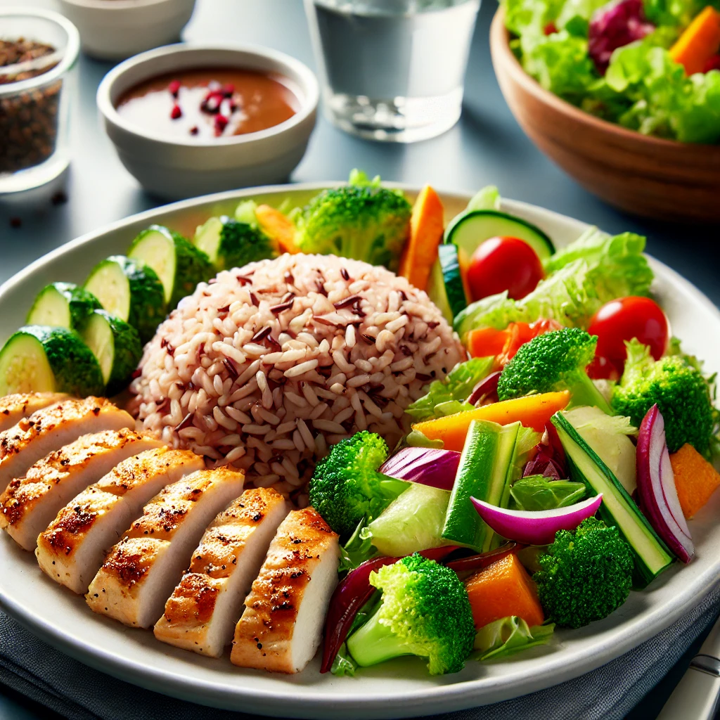 - 점심: 현미밥과 다양한 채소가 포함된 샐러드, 단백질이 풍부한 닭가슴살