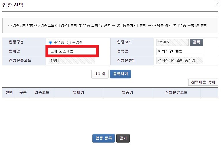 해외직구대행 업종코드 ' 525105 ' 조회 후 밑에 나오는 코드 더블클릭!!