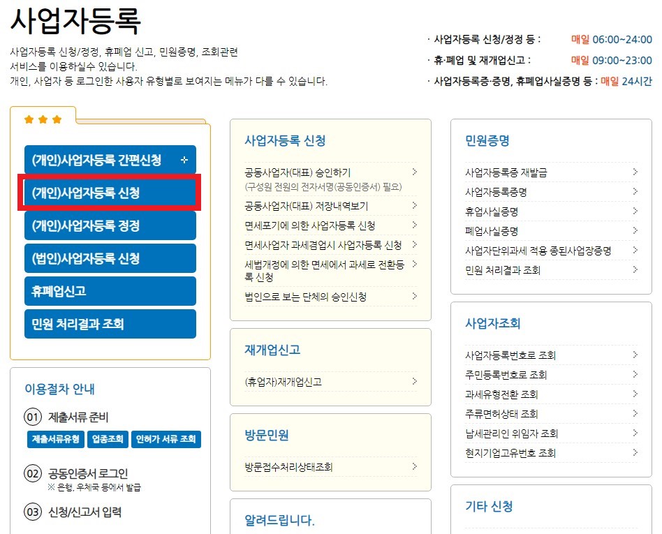 ④ (개인)사업자등록 신청을 눌러줍니다.